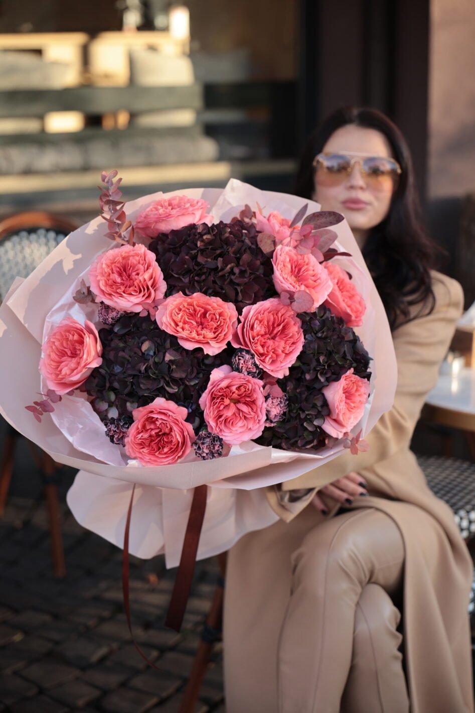 Осінній букет з гортензій та піоновидних троянд Кенді