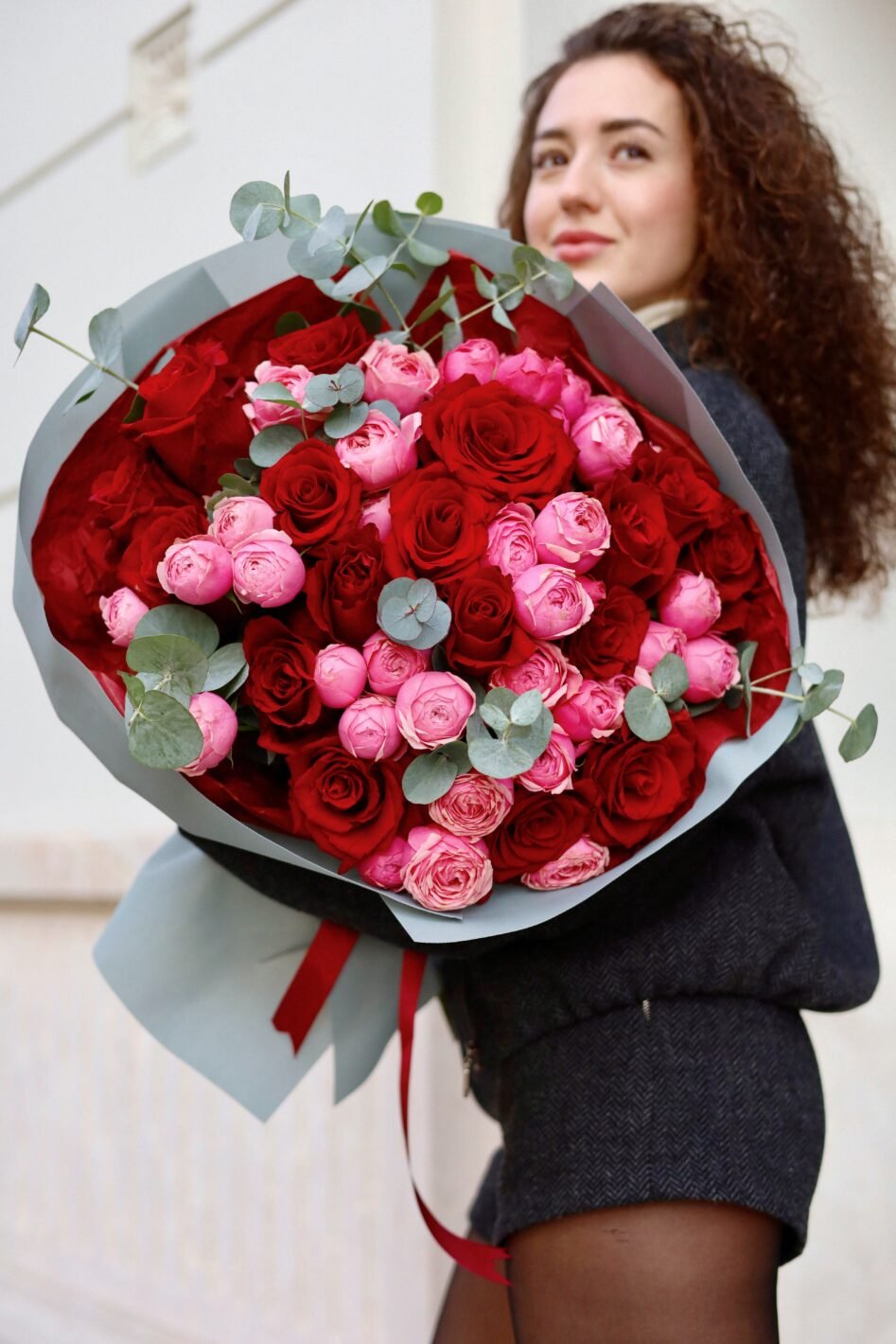 Поєднання Червоних троянд Експловер та піоновидних троянд Сільва пінк