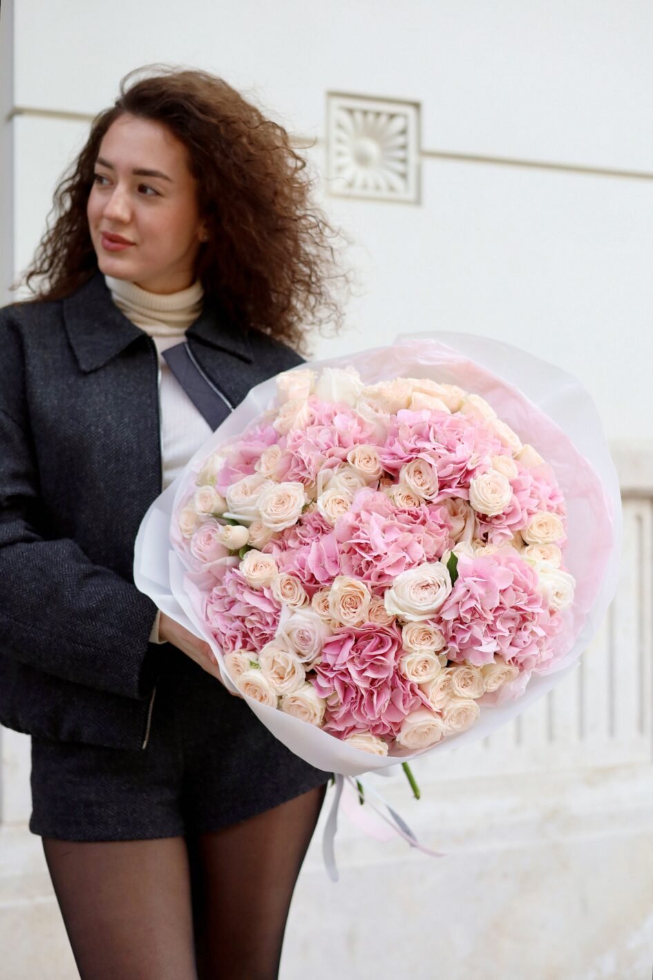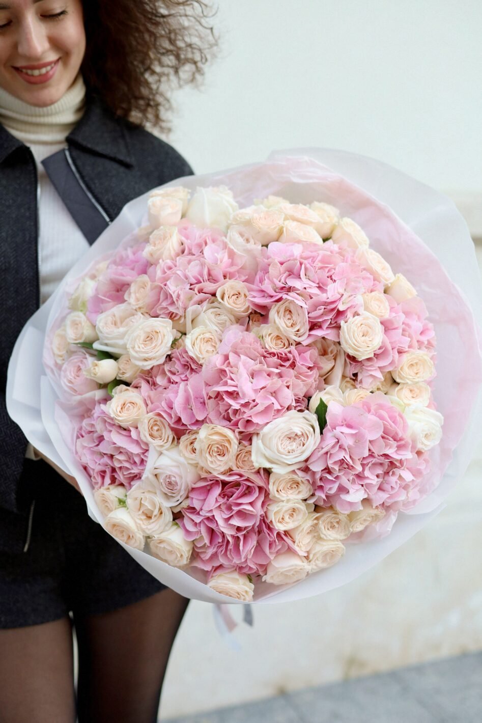 Поєднання рожевої гортензії та кущових троянд Софі