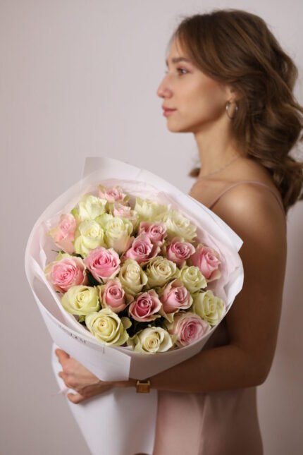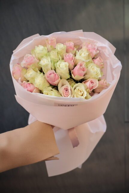 Оригінальна ціна: 8000 грн.6500 грнПоточна ціна: 6500 грн.Поєднання 25 білих та рожевих троянд Атена