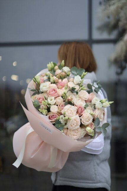 Оригінальна ціна: 2100 грн.1850 грнПоточна ціна: 1850 грн.Букет з троянд пінк атена, кущових піоновидних та еустоми