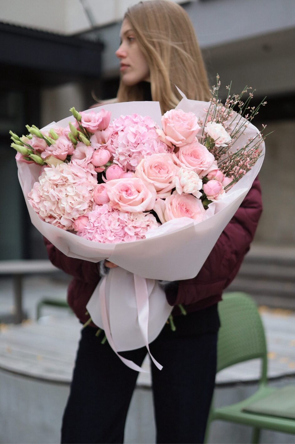 Рожевий міксований букет із гортензіями та парфумованими трояндами пінк охара