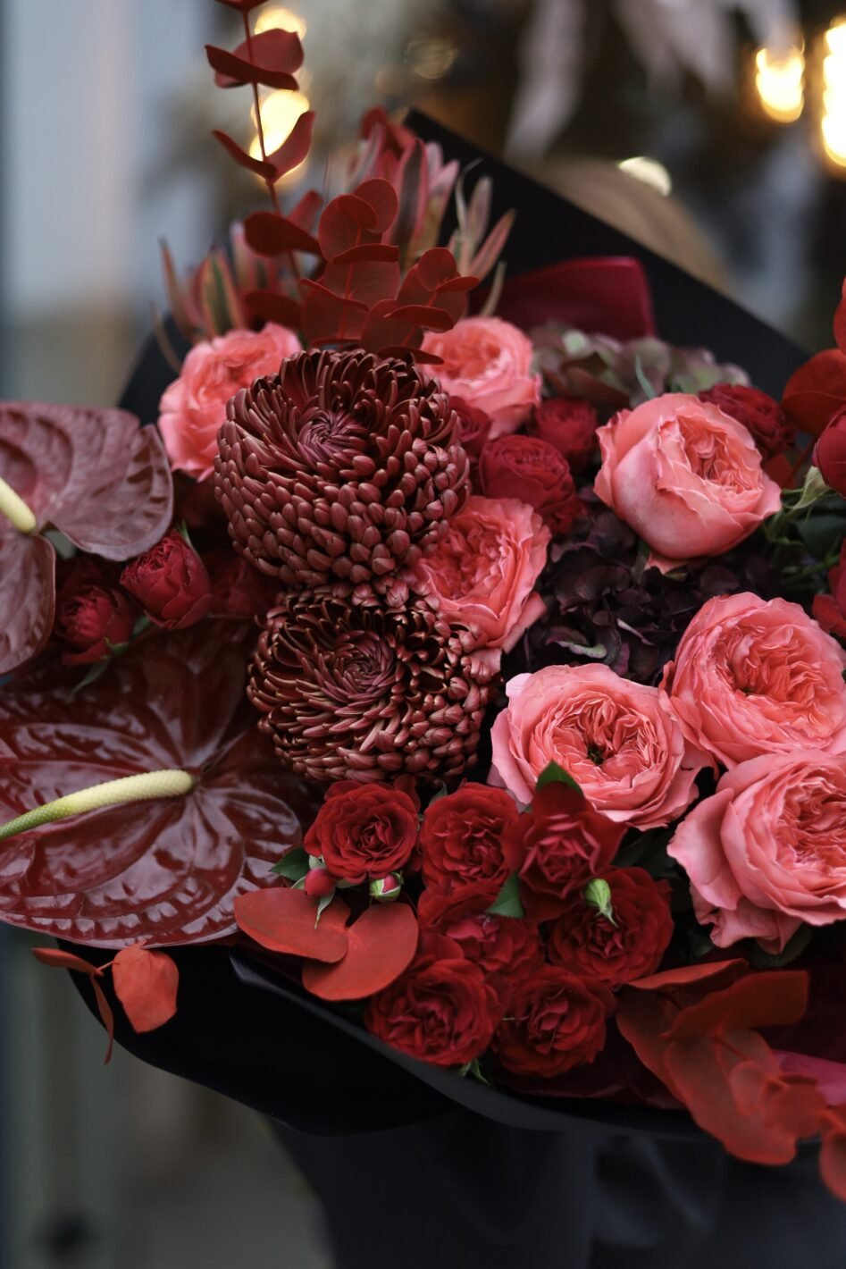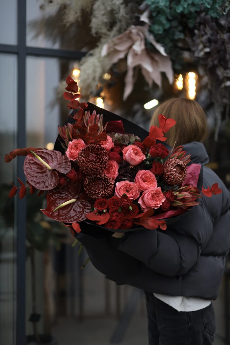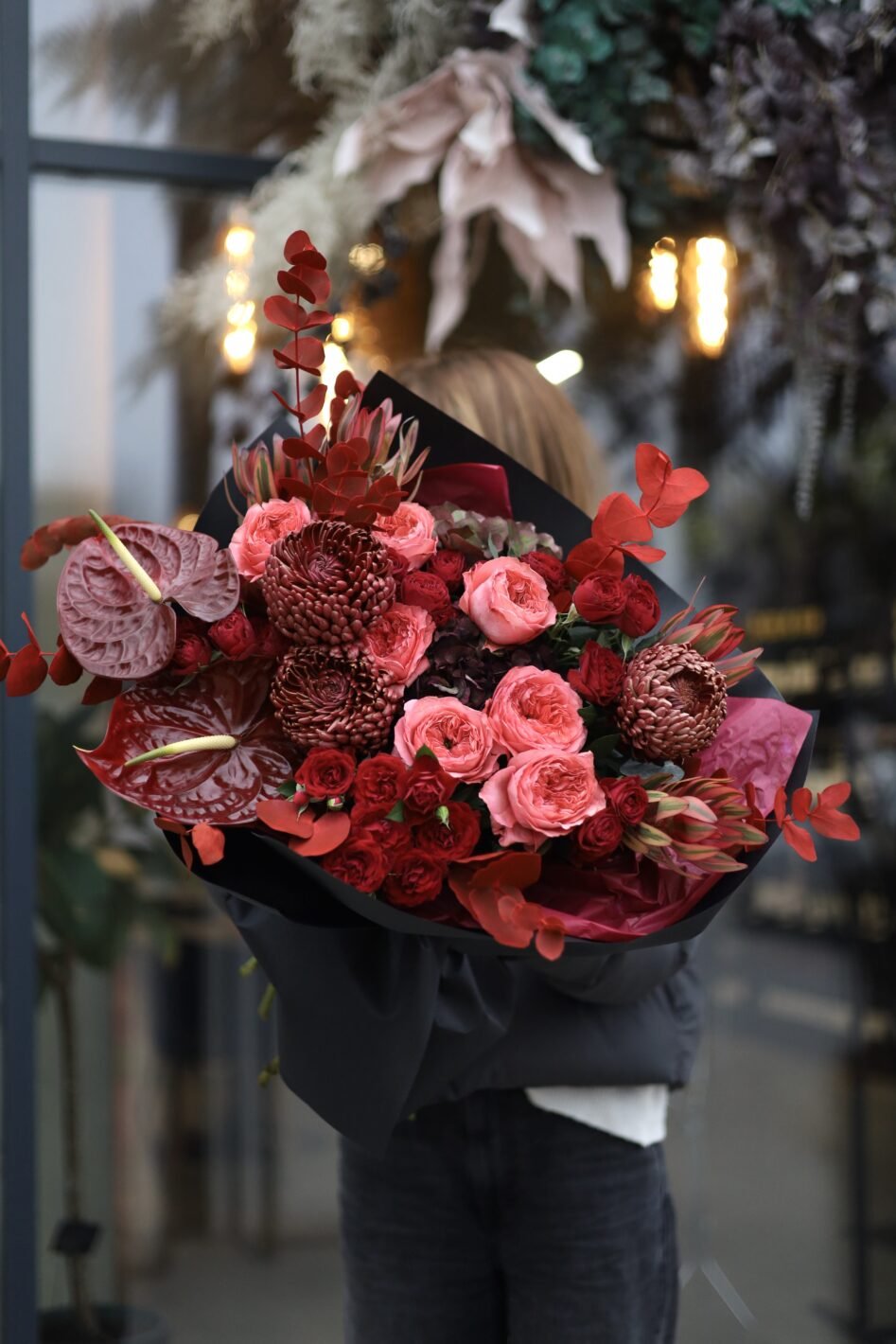 Розкішний мікс в насичений бордових кольорах з трояндами Кенді експрешн
