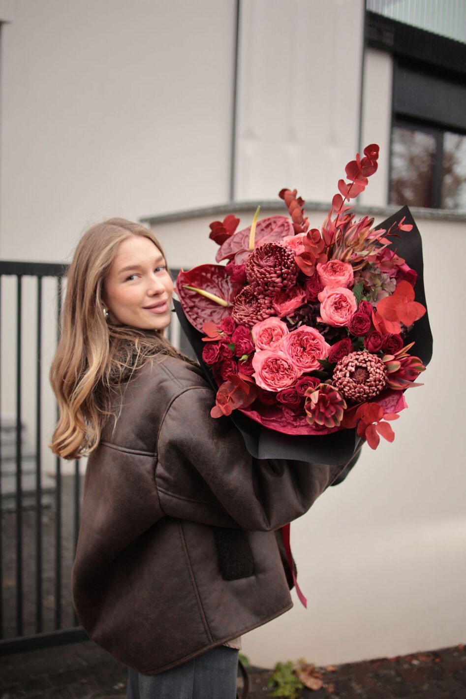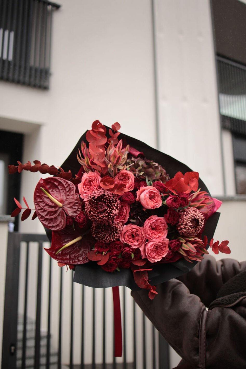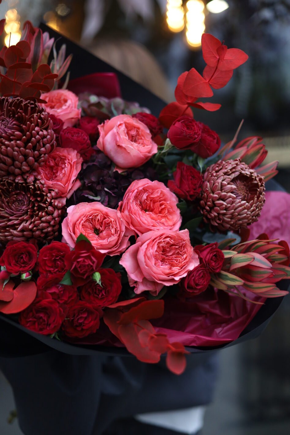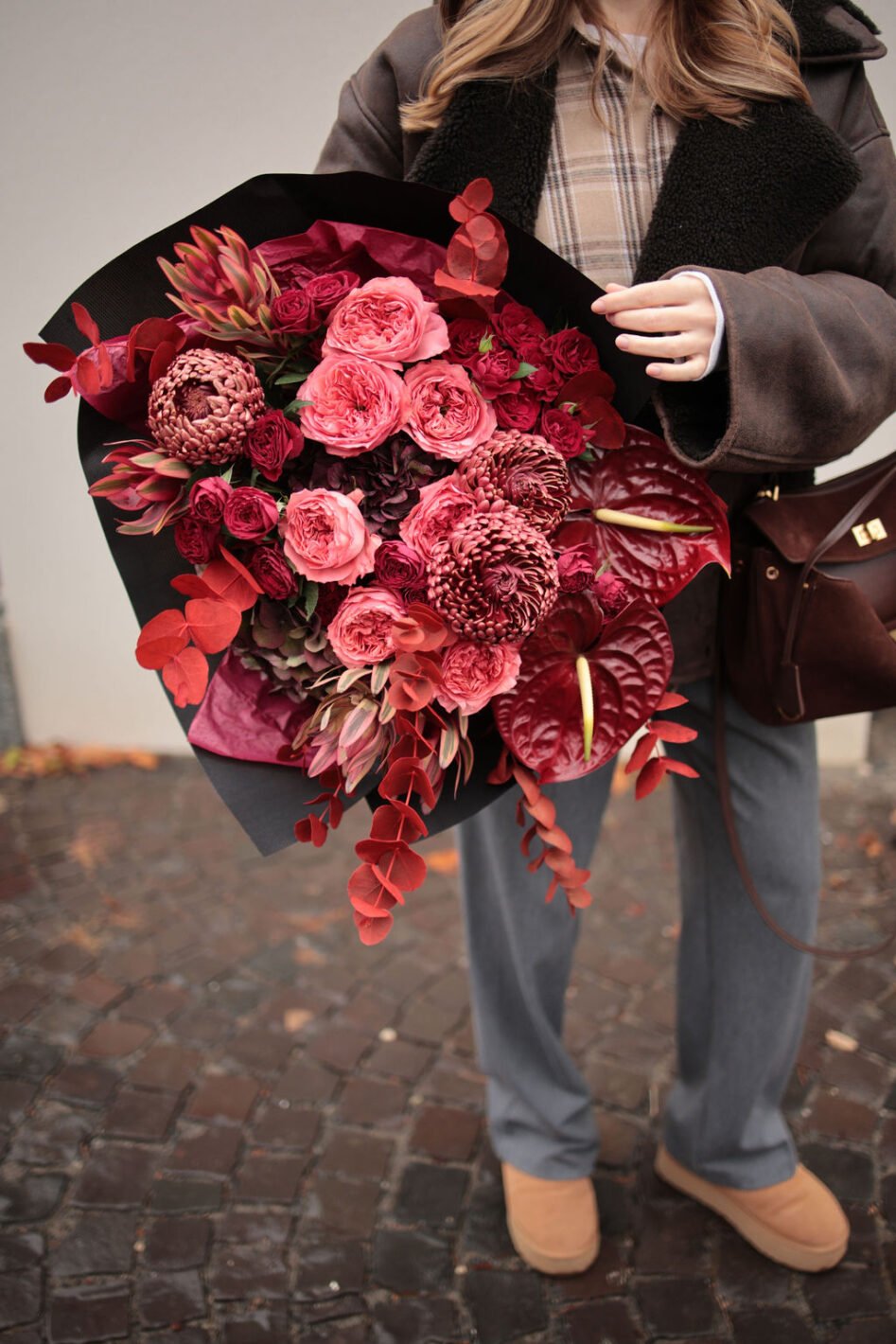 Розкішний мікс в насичений бордових кольорах з трояндами Кенді експрешн