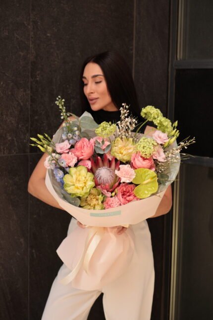 Біло-рожеве поєднання гортензії, кущової троянди та діантуса