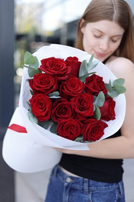 Букет з 15 червоних троянд Експлорер та евкаліптом