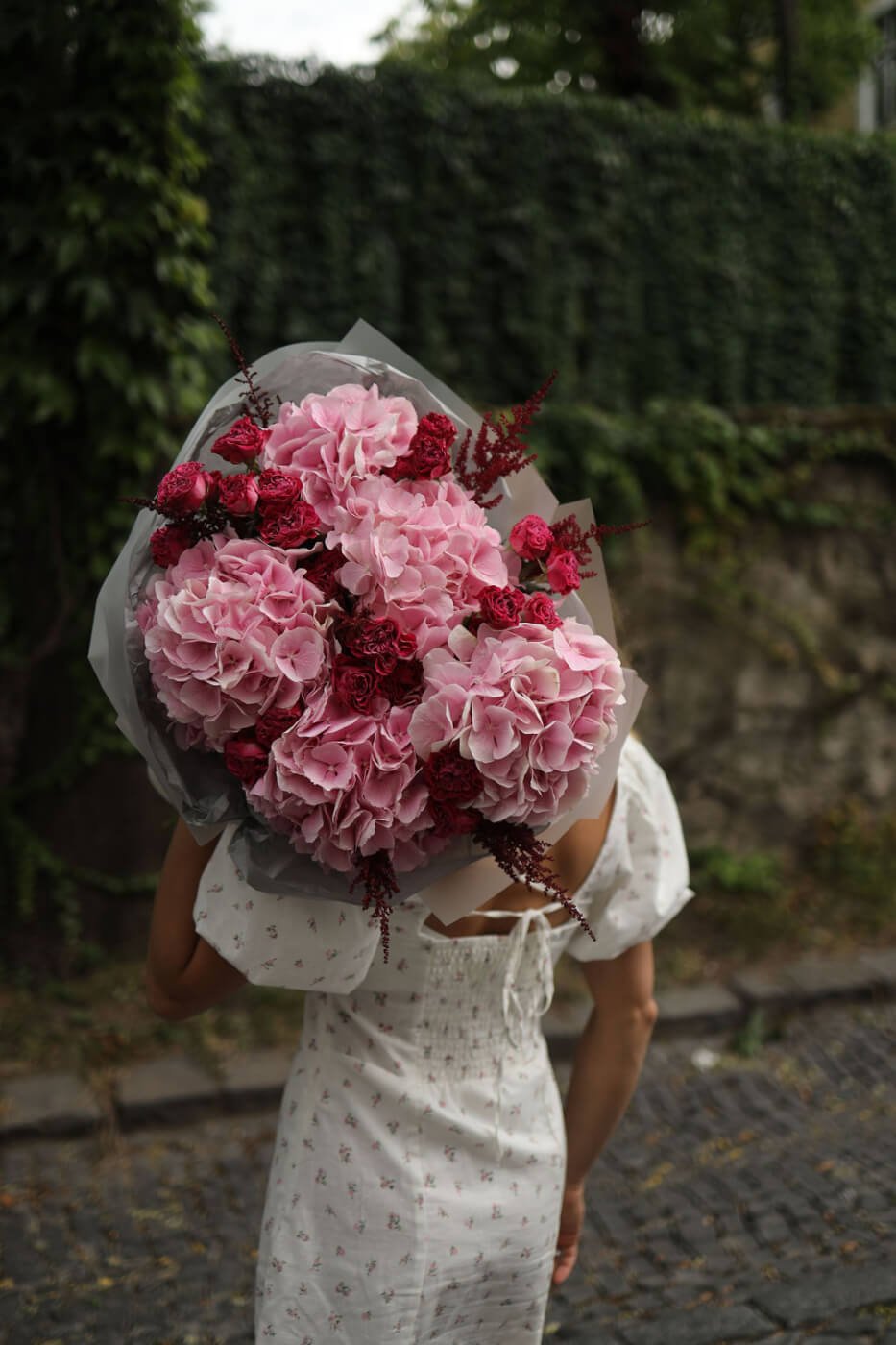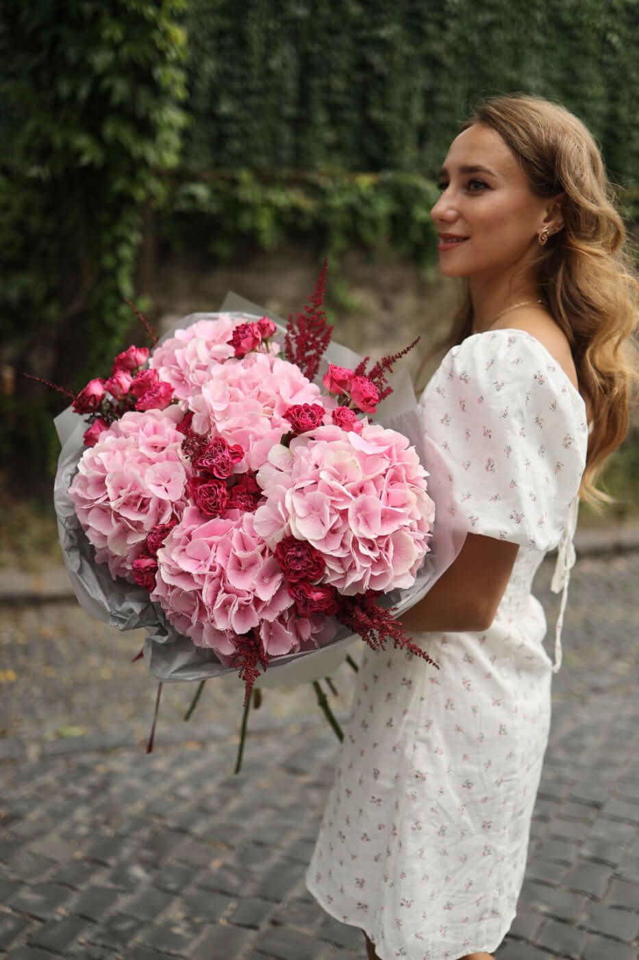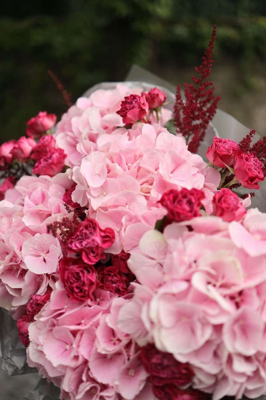 Великий букет з рожевих гортензій та малинових троянд Марвеловз