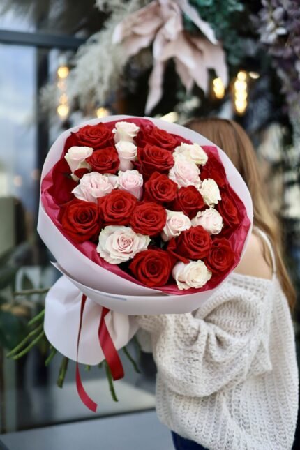 Букет 25 біло-рожевих троянд Атена