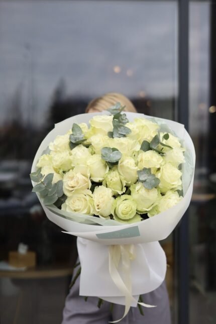 Монобукет із 25 троянд сорту Мондіаль з евкаліптом
