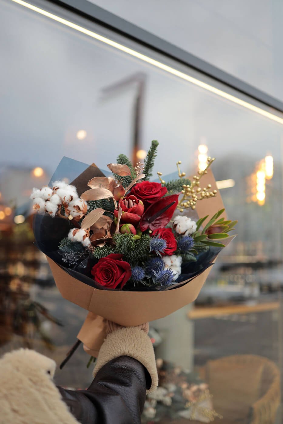 Яскравий букет з бавовни, хвої, червоних троянд та ягід