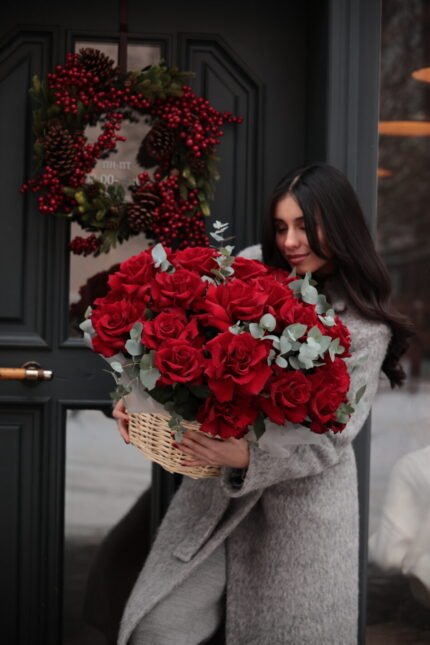 кошик з червоних троянд