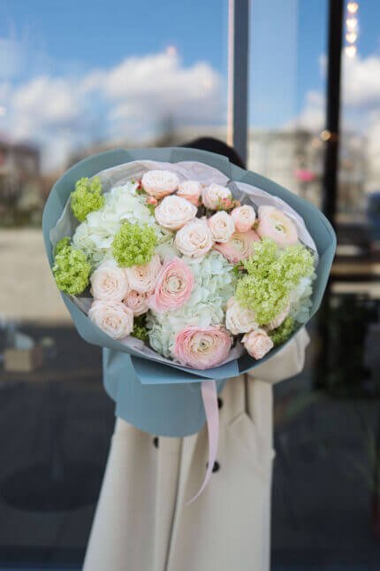 Ніжний міксований букет із ранункулюсами та трояндами пінк Мондіаль