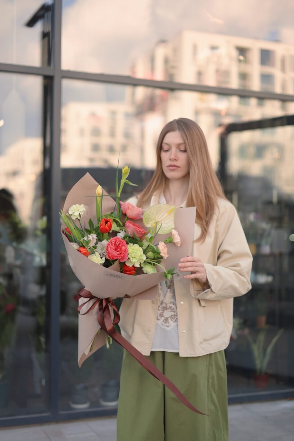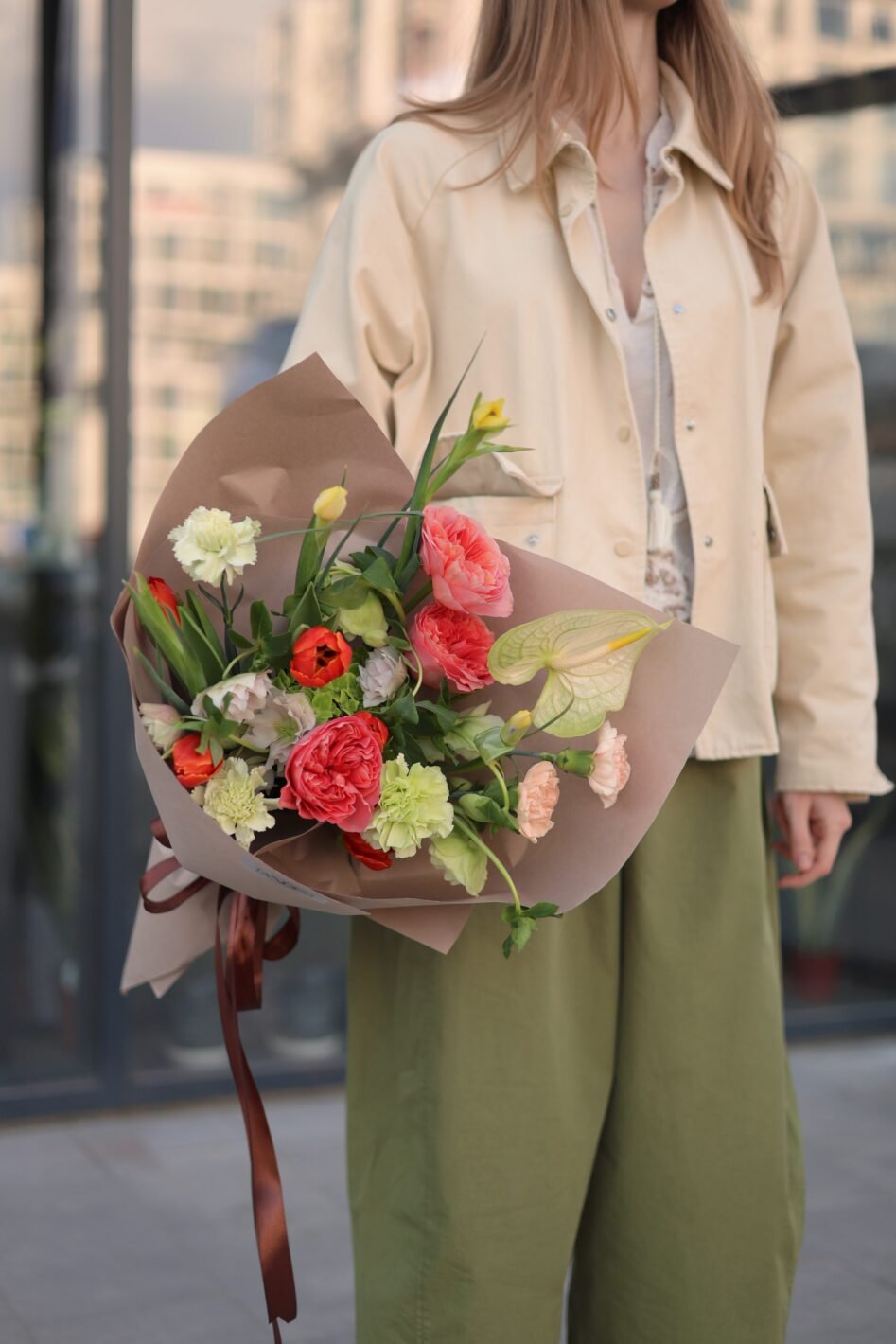 Весняний мікс з антуріумом та піоновидною трояндою Експрешен